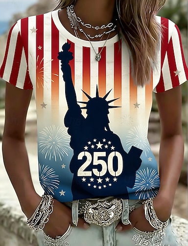 Unabhängigkeitstag Amerikanisches Jubiläum Patriotische Damen T-Shirt Druck Floral Grafik Buchstaben Stylisch Klassisch Lässig Kurzarm Crewneck Reguläre Oberteile Alltag Schwarz Weiß Rot Sommer