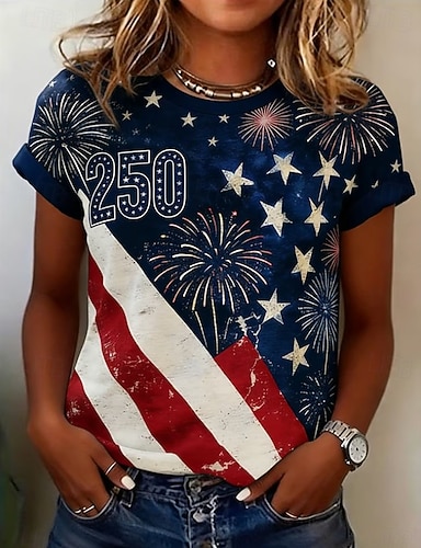 Amerikanischer Unabhängigkeitstag Damen T Shirt Druck Grafik Buchstabe Amerikanische Flagge Stilvoll Klassisch Lässig Kurzarm Rundhalsausschnitt Normale Oberteile Täglich Blau Schwarz Weiß Rote