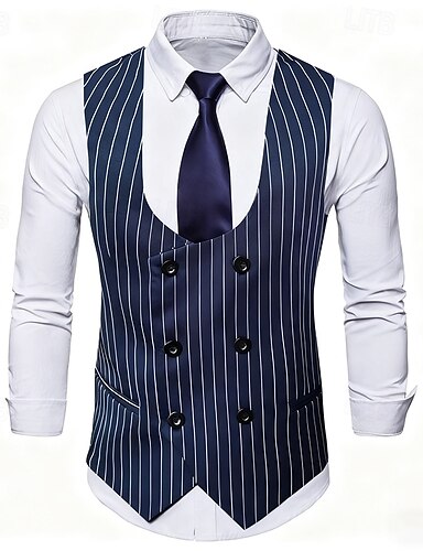 Herren Weste Gilet Urlaub Party Geschäft Mode Lässig Frühling Herbst Tasche Knöpfe Polyester Bequem Streifen Doppelreihig V Ausschnitt Normale Passform Marineblau Weste