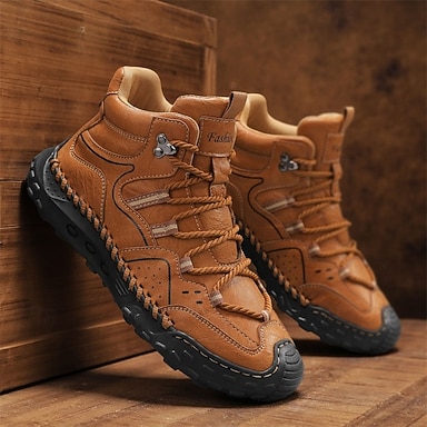 Herren-Wanderstiefel aus hellbraunem Kunstleder – strapazierfähig und stützend mit stilvollen Nähten, ideal für Outdoor-Abenteuer und Wanderausflüge