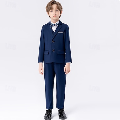 Ringträgeranzug Jungen Kinderanzug Blazer &Weste & Hose &Krawatte, Jungenanzug, lässig, für Outdoor-Partys, modisch, cool, Basic, einfarbig, Taschenknöpfe, schwarz, marineblau, Polyester