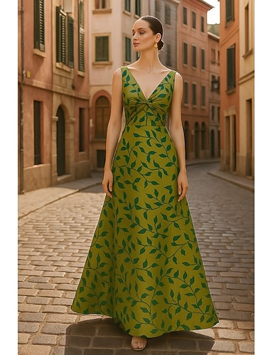 A-Linie Bodenlang Abendkleid Ballkleid Festliche Kleidung Hoher Schlitz Mutter der Braut Ärmellos V Ausschnitt Formell Hochzeitsgast Tasche Satin mit Blumenmuster Schlitz Tasche