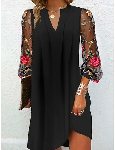Damen Minikleid Shiftkleid Lässig Täglich Lässiger Schnitt Blumen Dreiviertelarm V Ausschnitt Schwarz Sommer Frühling Herbst