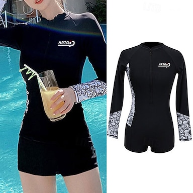 Damen Anti UV Shirt Badeanzug Einteilige Patchwork Reißverschluss UV Schutz Hohe Elastizität Langarm Bademode Surfen Tauchen Schnorcheln Sommer