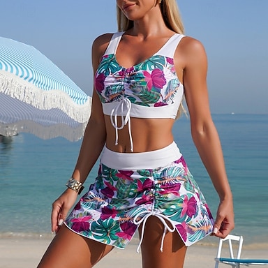 Damen Bikini 3-Teilig Badeanzug mit Rock Rock Slim Rückenfrei Urlaubs Strandbekleidung Floral Halterneck Ärmellos Bademode