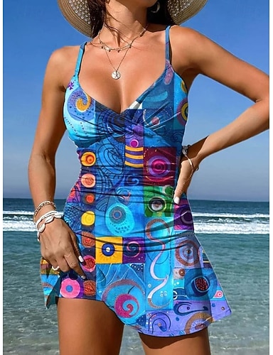 Damen Badeanzug Einteiler Rock Bademode Elegant Urlaub Blumen Grafik U-Ausschnitt Ärmellos Badeanzüge