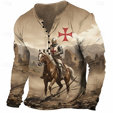 Herren Grafik Tempelritter T Shirt Henley Hemd T-Shirt Langarm Vintage Designer Stilvoll Lässig Täglich Outdoor Frühling & Sommer Frühling Blau Braun Rot Henley Henley T-Shirt