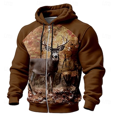 Herren-Kapuzenpullover mit Reißverschluss, realistisches Hirschmotiv, Jagd-Sweatshirt, Herbstwald-Wildtiere, Outdoor-Kapuzenjacke, braun, Größen S, M, L, XL, XXL, XXXL