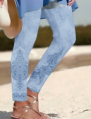 Damen Leggings Urlaub Vintage Ethno-Stil Knöchellang Hohe Taille Blumen Grafik 3D-Druck Schnelltrocknend Atmungsaktivität Weich Dehnbar Täglich Heim Outdoor Weiß Marineblau Blau Frühling Herbst