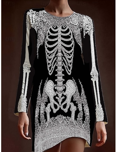 Damen Minikleid Pulloverkleid Urlaub Lässig Boho Täglich Ferien Ausgehen Schlank Grafik Schädel Langarm Rundhalsausschnitt Schwarz Weiß Rote Orange Herbst Winter