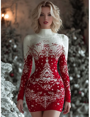Damen Pullover Kleid Stilvoll Schneeflocken Rollkragen Druck Langarm Normale Oberteile Crop Tops Stricken Weihnachten Rote Herbst Winter