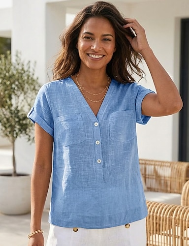 Damen Hemd Knopfleiste Bluse Kunstbaumwollleinen Tasche Knöpfe Einfarbig Stilvoll Lässig Kurzarm V Ausschnitt Normale Oberteile Täglich Schwarz Weiß Rosa Khaki Leicht Blau Sommer Frühling