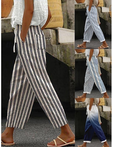 Damen Kunstbaumwollleinen Sommerhose Hosen Hose Alltagstauglich Knöchellang Natürliche Taille Grafik Gestreift Kordelzug Seitentaschen Atmungsaktivität Bequem Mikroelastisch Wochenende Königliches