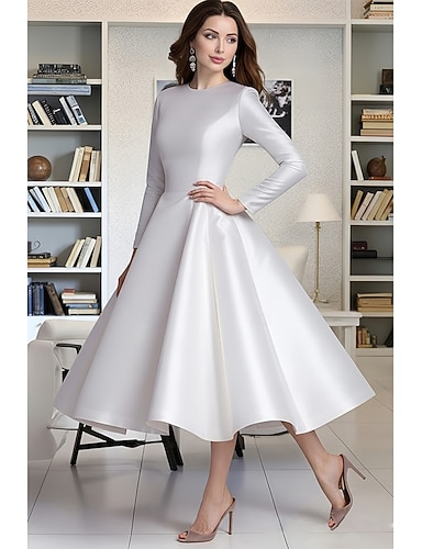 A-Linie Tee-Länge Satinkleid Partykleid Cocktailkleid Brautmutterkleid Langarm Rundhalsausschnitt Elegant Einfach Familientreffen Geburtstag Satin mit Einfarbig