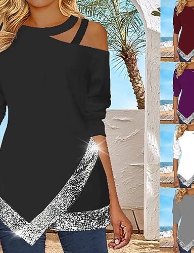 Damen Bluse Pailletten Patchwork Einfarbig Stilvoll Lässig Langarm Rundhalsausschnitt Normale Oberteile Täglich Schwarz Weiß Wein Purpur Hellgrau Frühling Herbst