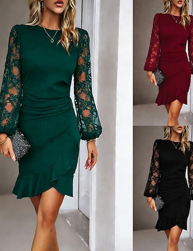 Damen Minikleid Etui-Kleid Elegant Party Cocktail Outdoor Party Hochzeitsgast Spitze Patchwork Normale Passform Einfarbig Langarm Rundhalsausschnitt Schwarz Wein Dunkelgrün