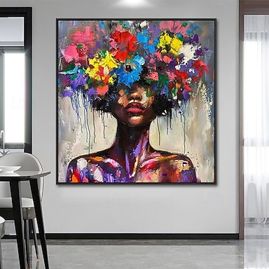 handgefertigtes Ölgemälde auf Leinwand, Wandkunst, Dekoration, modernes abstraktes Porträt, afrikanisches Mädchen, Blumenfee, für Heimdekoration, gespannter Rahmen, hängendes Gemälde/gerolltes