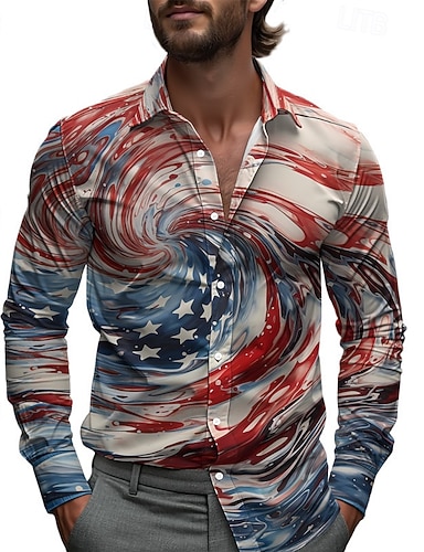 Herren Amerikanische Flagge Hemd Lässiges Hemd Strandhemd Langarm Lässig Bequem Urlaub Straße Hawaiianischer Frühling Herbst Revers Druck Dunkelblau Rot Blau