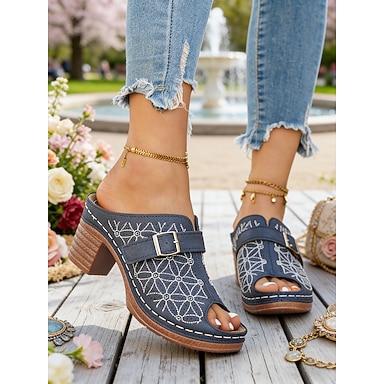 Blaue, bestickte Pantoletten mit Blockabsatz für Damen – Sandalen mit floraler Schnalle für Brunch, Gartenpartys und den Alltag im Retro-Stil