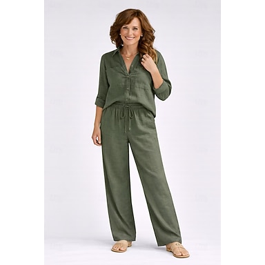 Damen Hosen-Sets Kunstbaumwollleinen Langarm Hemdkragen Einfarbig Elegant Mode Streetwear Lässig Täglich Outdoor Armeegrün Dunkelmarine Khaki Sommer Normale Passform