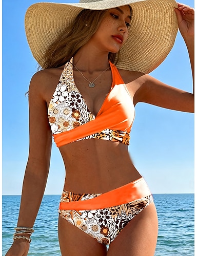 Damen Bikini 2 Teilig Badeanzug Unterdraht Frech Slim Rückenfrei Urlaub Strandmode Blumen Grafik Halterhals Ärmellose Badeanzüge