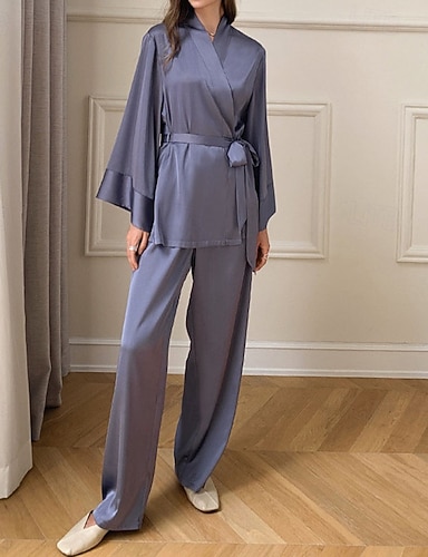 Damen Schlafanzug Robe Sexy Lässig Weich Einfarbig Schnürung Täglich Heim Bett Langarm Träger Schwarz Weiß Wein Gold Dunkelgray Sommer Frühling Normale Passform