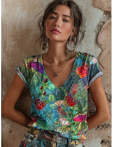 Damen T Shirt Druck Blumen Grafik Graffiti Bohemien Vintage Klassisch Kurzarm V Ausschnitt Normale Oberteile Täglich Grün Sommer Frühling