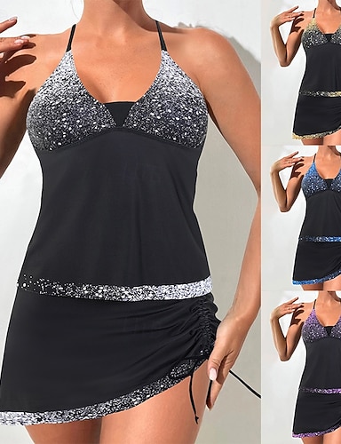 Damen Tankini 2-teilig Badeanzug Rüschen Rock Bauchkontrolle Hohe Taille Schmal Rückenfrei Urlaubs Strandbekleidung Ombre Halter Hals Ärmellose Badeanzüge