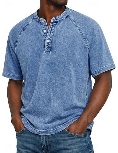 Herren T Shirt Henley Hemd Jeanshemd Hemd aus 100 % Baumwolle in Säurewaschung T-Shirt Kurzarm Einfach Vintage Streetwear Lässig Stückgefärbt Gewaschen Raglanärmel Stehkragen Henley Lässig Heim Straße
