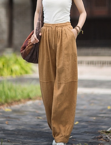 Damen Hose aus Baumwollleinen Chinos Sommerhose Haremshose Urlaub Basic Lässig Volle Länge Mittlere Taillenlinie Einfach Kordelzug Tasche Bequem Unelastisch Täglich Outdoor Straße Hellgelb gelbbraun