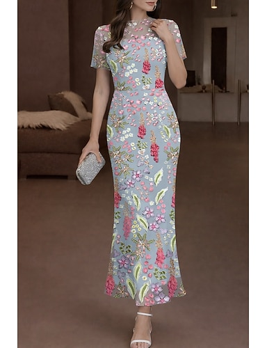 Meerjungfrauenschnitt Knöchellänge Cocktailkleider Elegant Vintage Blumen Kurzarm Rundhalsausschnitt Hochzeit Formell Spitze mit Gestickte Blume 3D-Blumen Applikationen