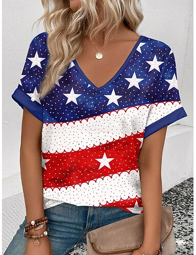 Amerikanischer Unabhängigkeitstag Damen T Shirt Druck Grafik Flagge Vintage Stilvoll Klassisch Kurzarm V Ausschnitt Normale Oberteile Täglich Blau Schwarz Weiß Rote Sommer Frühling