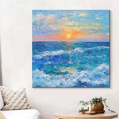 Handgemaltes Ölgemälde auf Leinwand, moderne abstrakte Sonnenaufgangs- und Meereslandschaft, Wanddekoration für Zuhause, auf Keilrahmen gespannt / gerollt, ungespannt