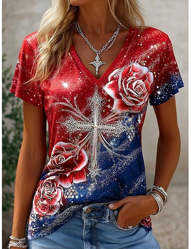 Unabhängigkeitstag Patriotische Frauen T-Shirt Druck Grafik Flagge Stylisch Klassisch Lässig Kurzarm V-Ausschnitt Reguläre Tops Alltag Blau Rot Rot Blau Sommer Frühling