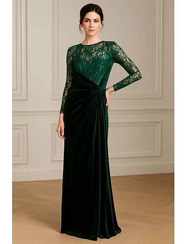 Schlauchkleid Bodenlang Abiballkleider Abendkleid Ballkleid Festliche Kleidung Elegant Schwarzes Kleid seidig Langarm Illusionsausschnitt Hochzeit Formell Spitze Samt mit Falten