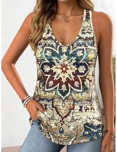 Damen Tank Top Druck Grafik Paisley-Muster Bohemien Stilvoll Ärmellos V Ausschnitt Lange Oberteile Lässig Strand Ausgehen Gelb Khaki Sommer Frühling