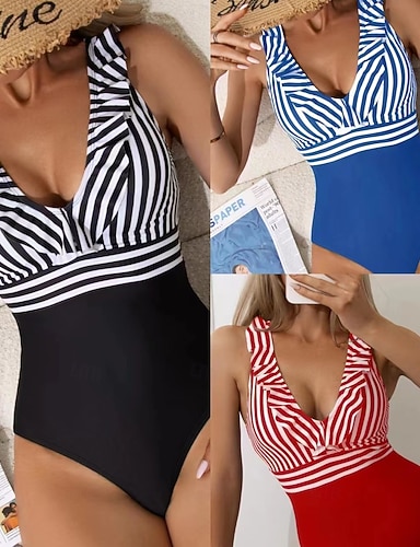 Damen Einteiler Badeanzug Slimming Farbblock Monokini Rüsche Bauchkontrolle Hohe Taille Slim Rückenfrei Urlaub Strandbekleidung Gestreift V-Ausschnitt Ärmellos Badeanzüge