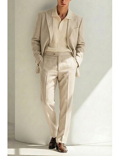 Herren Leinenanzüge Strandhochzeit Beige Frühling, Herbst, Winter, Sommer Anzug Gekerbtes Revers Mode Leicht Einfarbig Standard Passform 2-teilig Einreiher - 1 Knopf
