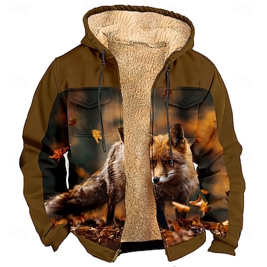 Herren Fuchs Fleece Kapuzensweatshirt Jacke Pullover Mode Cool Täglich Vintage-Retro Mit Kapuze Outdoor Geschenk Jagd Blau Braun Braun 2 Reißverschluss Tasche Herbst Winter Designer S M L XL XXL XXXL