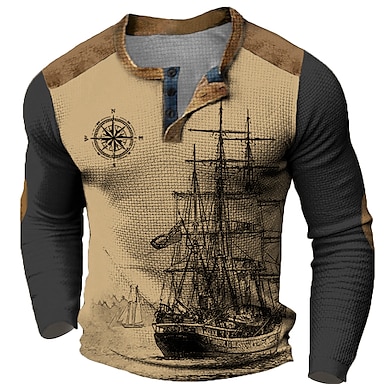Herren Schiff Nautisch Kompass Henley Hemd Waffel-T-Shirt Langarm 3D-Druck Designer Retro Vintage Lässig Sport im Freien Ferien Festival Frühling & Herbst Blau Leicht Braun Braun Grün Grau Henley