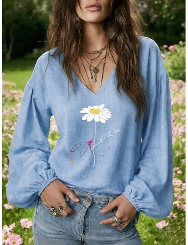 Damen Leinenähnliche Kunstbaumwoll Leinen Hemd Druck Grafik Gänseblümchen Elegant Bohemia Vintage Langarm V-Ausschnitt Reguläre Oberteile Täglich Urlaub Blau Gelb Rosa Lila Grün Sommer Frühling