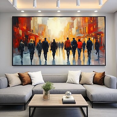 Ölgemälde, handgemalt, urbanes Stadtbild auf Leinwand, stimmungsvolle abstrakte Straßenszene mit Menschen und goldenen Akzenten für moderne, zeitgenössische und industrielle Wohndekoration
