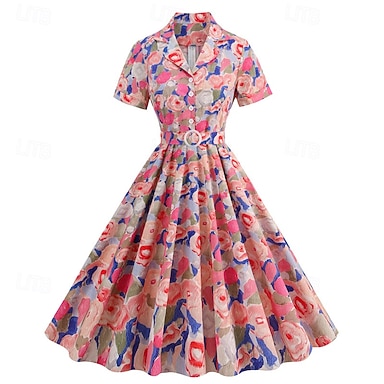 Rockabilly Midlänge A-Linien-Kleid Kurze Ärmel Tailliert und ausgestellt Kostüm Damen Karneval Valentinstag Lässig Heimkehr Retro-Mottoparty Erwachsene Kleid Frühling