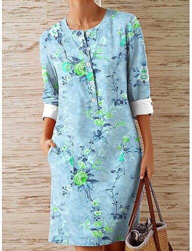 Damen Midikleid Kunstbaumwollleinen Hemdblusenkleid Freizeitkleid Basic Modern Täglich Wochenende Lässiger Schnitt Einfach Dreiviertelarm V Ausschnitt Blau Schwarz Rosa Wein Sommer Frühling