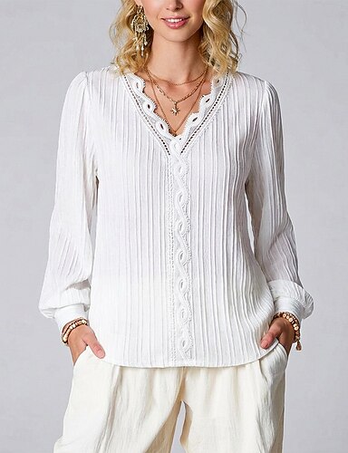 Damen Elegant T Shirt Oberteil mit Spitzenspleiß Spitze Patchwork Einfarbig Elegant Stilvoll Basic Langarm V Ausschnitt Normale Oberteile Täglich Ausgehen Wochenende Weiß Rote Purpur Orange Grün