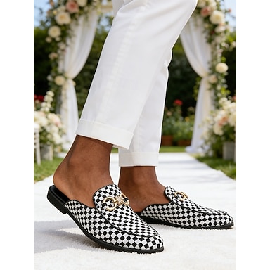 Schwarze und weiße karierte Herren-Hochzeitspantoffeln mit Strassschnalle zum Hineinschlüpfen – elegante Schuhe für Bräutigam, Trauzeugen, Hochzeitsfeier, Gartenhochzeit, formelle Abendveranstaltungen