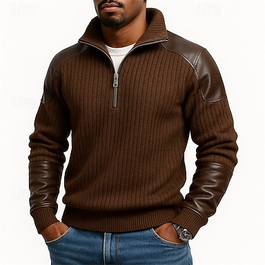 Herren Sweatshirt Pullover Viertelreißverschluss Sweatshirt Rippenstrick Braun Stehkragen Einfach Patchwork Sport & Outdoor Lässig Täglich Streetwear Cool Sportbekleidung Frühling & Herbst Herbst
