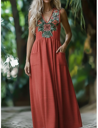 Damen Maxikleid Boho-Kleid Blumenkleid Vintage Mode Modern Outdoor Urlaub Ausgehen Normale Passform Blumen Ärmellos V Ausschnitt Rote Sommer Frühling