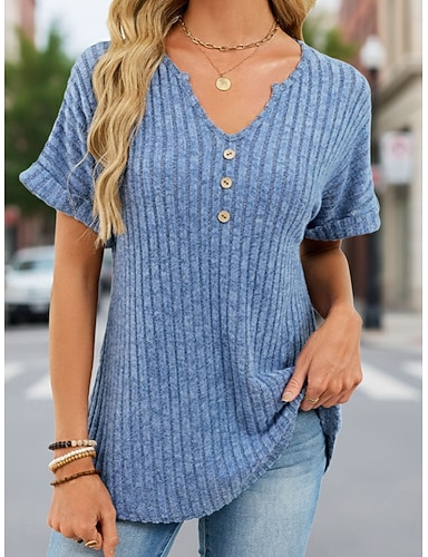 Damen T Shirt T-Shirt Waffelstricktops Knopf vorne Einfach Mode Stilvoll Klassisch Kurzarm Henley Normale Oberteile Täglich Ausgehen Wochenende Blau Sommer Frühling