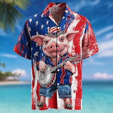 Herren 250. Jahrestag des Unabhängigkeitstages der USA am 4. Juli Schwein US Flagge Hemd Knopfhemd Kurzarm Modisch lässig Outdoor Ferien Sommer Frühling Umlegekragen 3D-Druck Hemden mit Kragen Rot 1